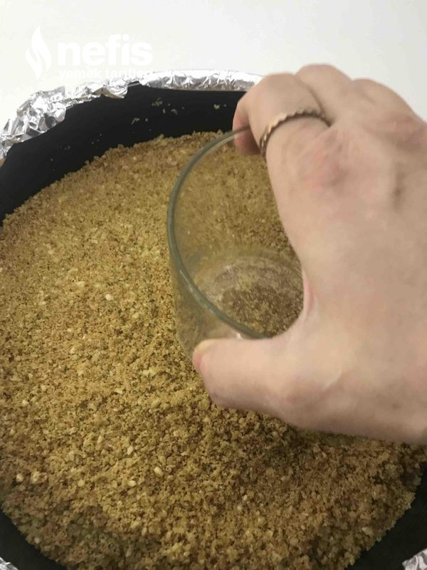 - Kelepçeli kalıbın altına pişirme kağıdı koyup üzerine bisküvili karışımı döküp altı düz bardak ile düzelttim. Alt tabanı hazır.