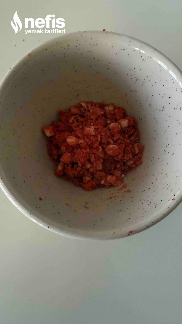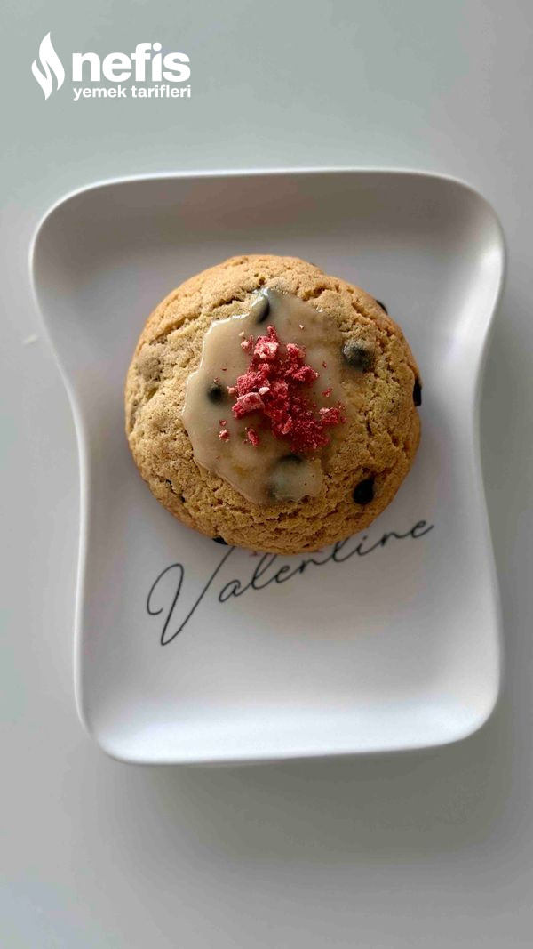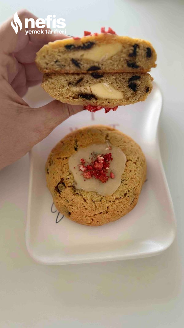 12. Beyaz çikolata eritip kurabiyenin üzerine sürün ve kurutulmuş çileği dökün. Afiyet olsun.