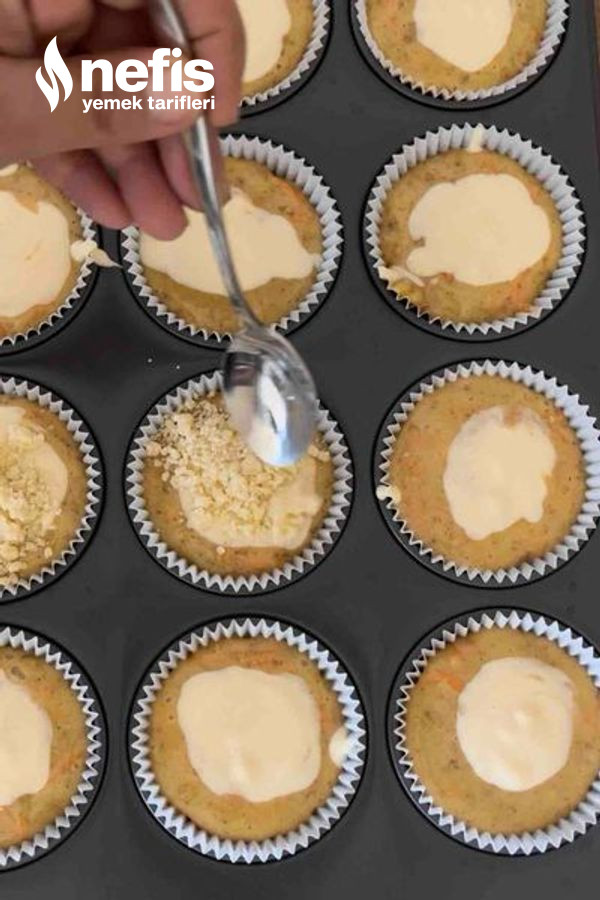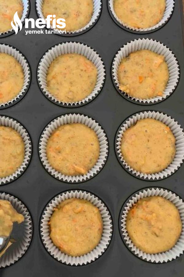 - Muffin kaplarına dondurma kaşığı yardımıyla kek karışımından koyalım.