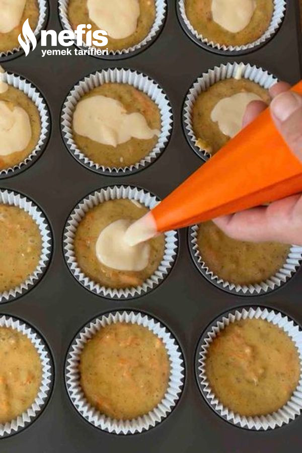 - Cheesecake karışımını krema torbasıyla keklerin ortasına sıkalım.