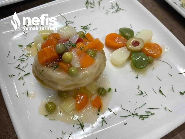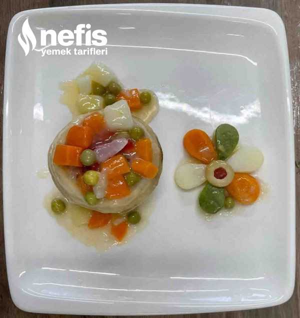 6. Sunum için; oda sıcaklığına geldikten sonra buzdolabında soğutalım. Üzerine zeytinyağı gezdirerek servis edelim. Tabağın içine ünce kıyılmış dereotu serpiştirip, sebzelerden çiçek yapabiliriz.