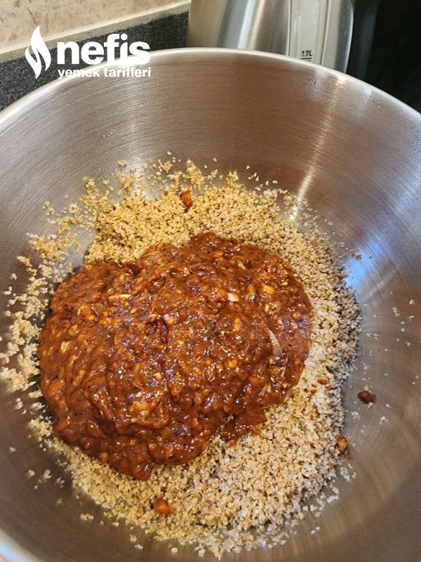 - Ayrı bir kapta rendelenip suyu sıkılmış kuru soğan ve sarımsağı; domates ve biber salçaları, isot, pul biber, kırmızı toz biber, karabiber, kimyon, nar ekşisi, limon suyu, pekmez ve zeytinyağıyla karıştırın.