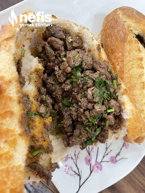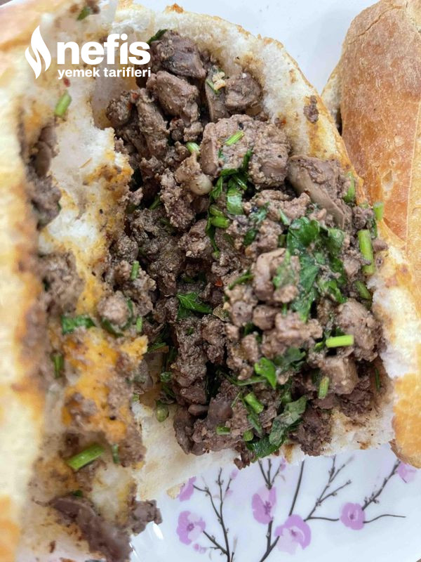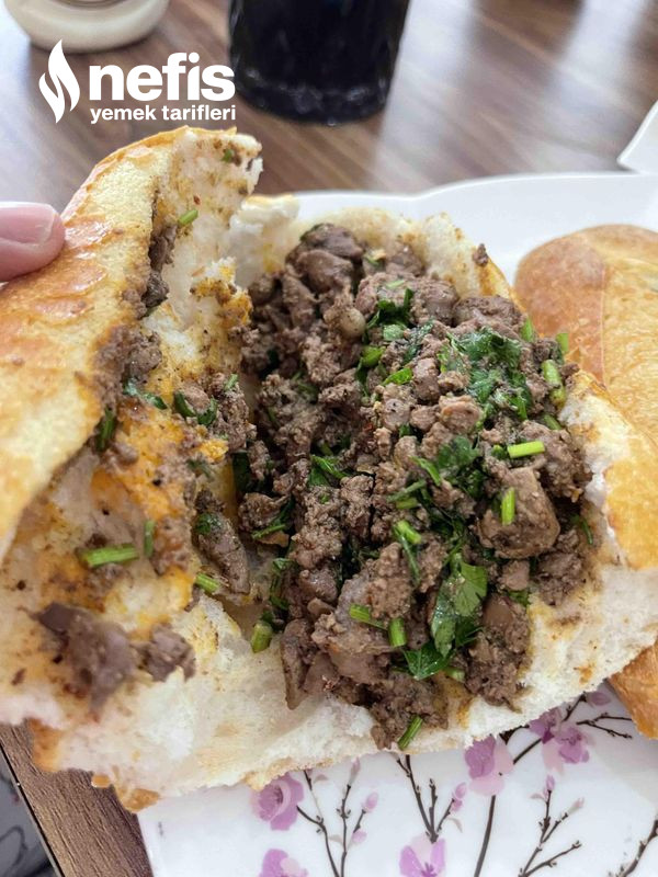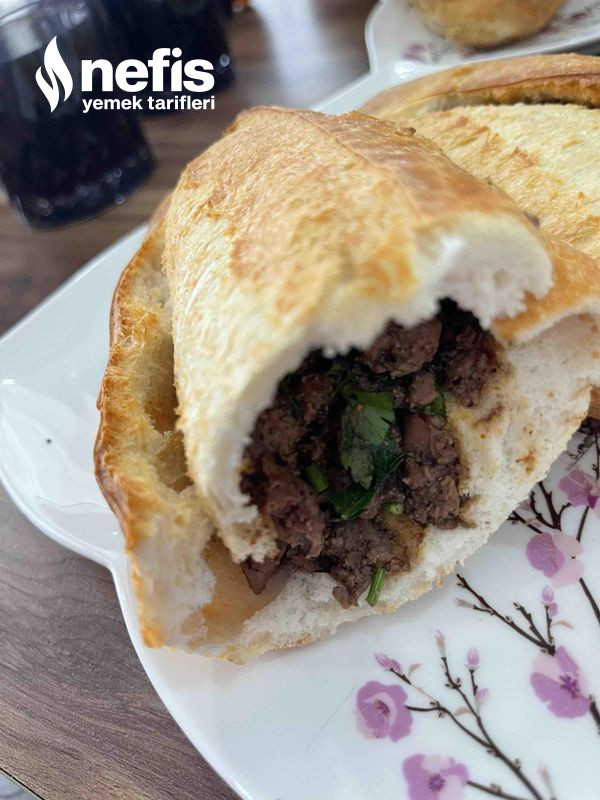 - Çıtır somun ekmeğimizi ikiye bölelim hafif tavanın yağına banalım ve içlerine ciğer dolduralım.