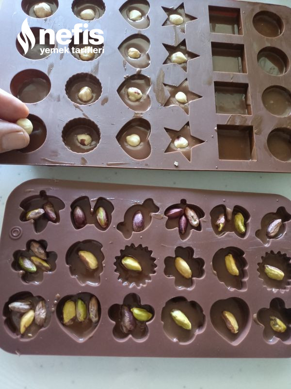 2. Kalıpların içine erimiş çikolatadan yarısına gelecek halde çikolatadan koyuyoruz.