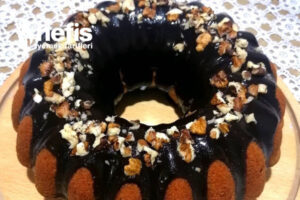 - Pişen kekimizi kalıptan çıkarıp çikolata sosunu döküyoruz.