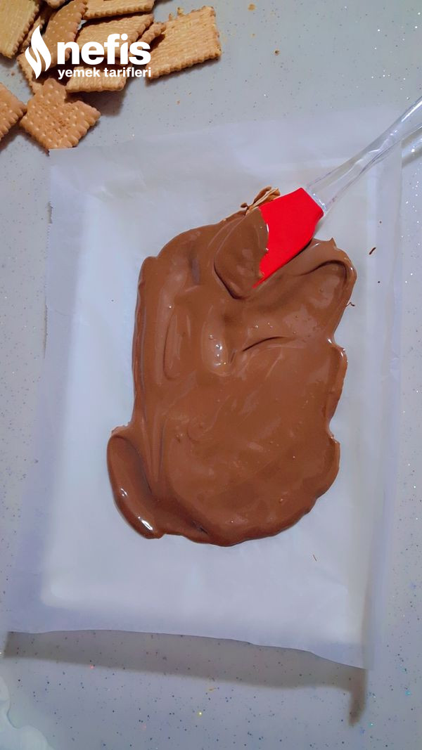- Çikolatayı benmari metodu eritin uygun bir tepsiye yağlı kağıt serin eritilmiş çikolatayı döküp yayın yavaşça sallayın üzeri düzleşsin.