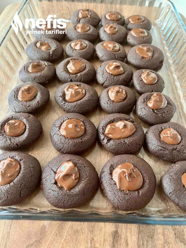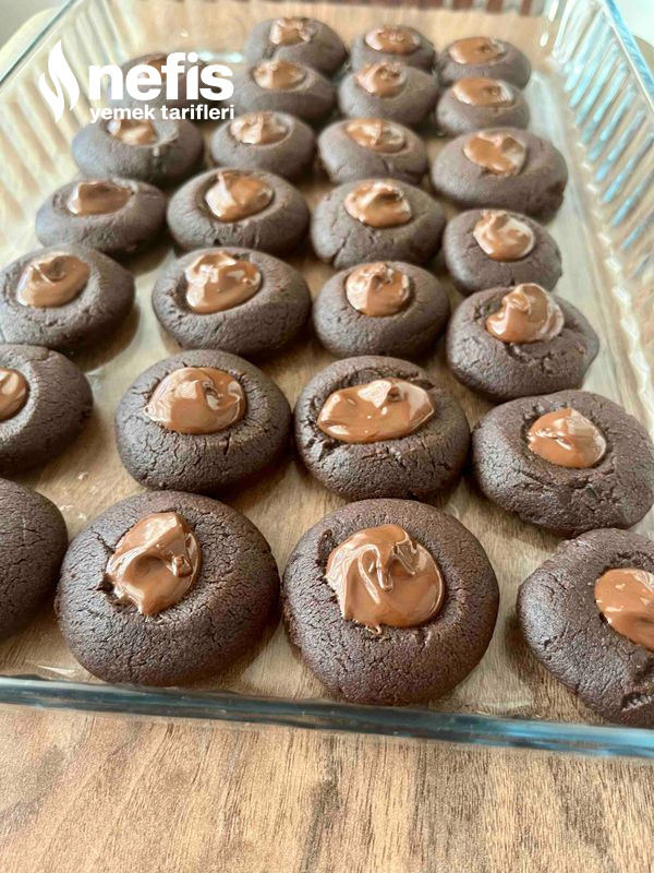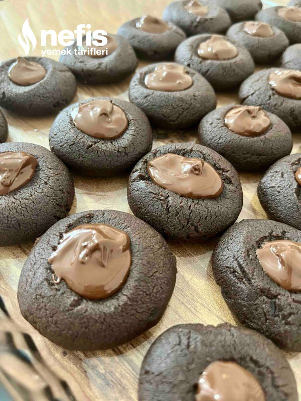 7. Ardından hazırladığımız çikolatayı kurabiyelerin üstündeki çukur kısımlara dolduruyoruz. Deneyecek herkese afiyet olsun.