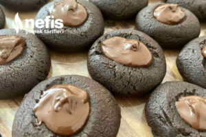 7. Ardından hazırladığımız çikolatayı kurabiyelerin üstündeki çukur kısımlara dolduruyoruz. Deneyecek herkese afiyet olsun.