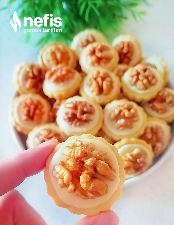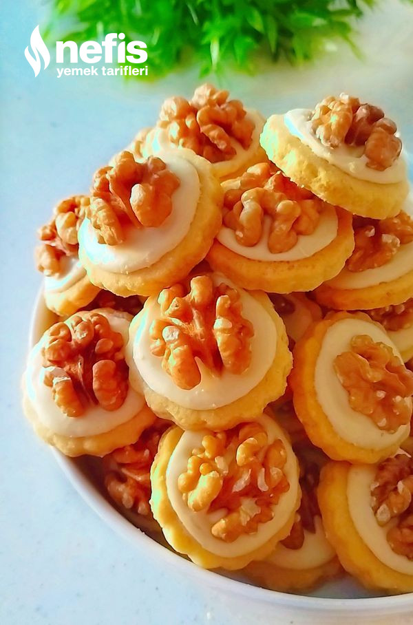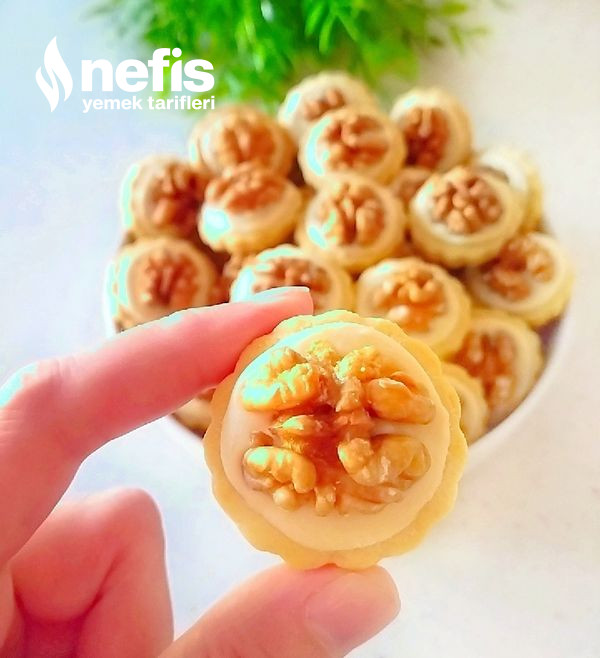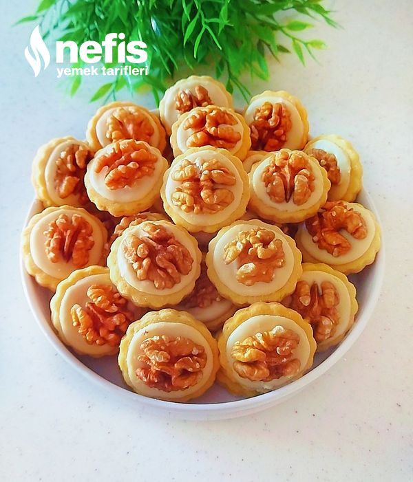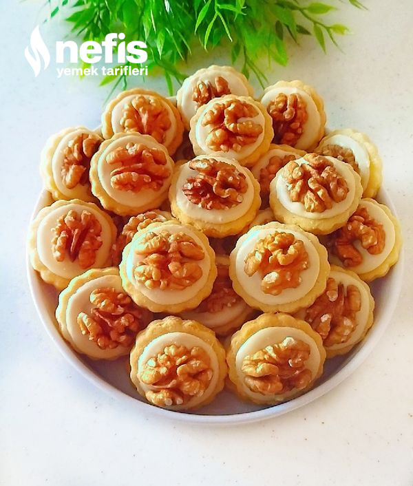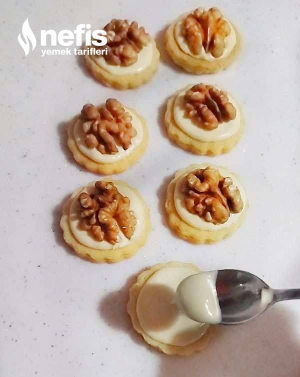 - Kurabiyeler soğuduktan sonra benmari adabı eritip soğuyan çikolatadan 1 er çay kaşığı ortalarına koyun kaşığın altıyla yayın üzerine ceviz yerleştirin.