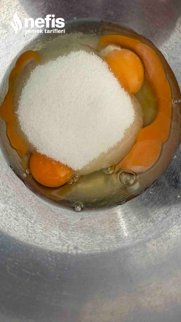 2. Yumurtaları ve şekeri bir kapta mikserle çırpın, içine tereyağı karışımı ekleyin.