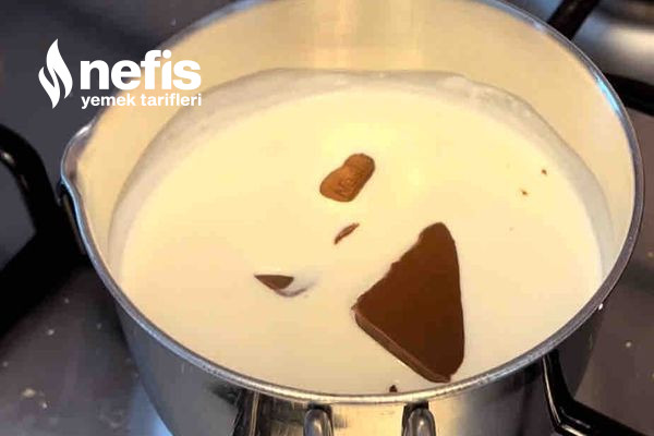 3. Sosu için uygun bir kapta 1 paket kremayı ısıtıp içine 1 paket çikolata ve 1 yemek kaşığı sürülebilir fındık kremamızı ekleyip homojen bir kıvam alana kadar karıştırıyoruz.