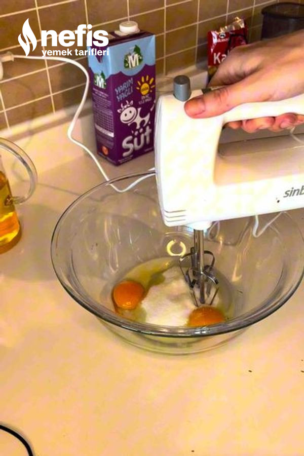 1. Yumurta ve şekeri köpük köpük olana kadar çırpıyoruz, sonrasında sıvı yağ ve sütü ekleyip tekrar çırpıyoruz.