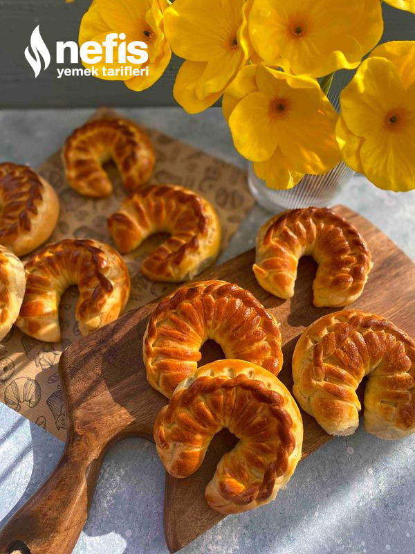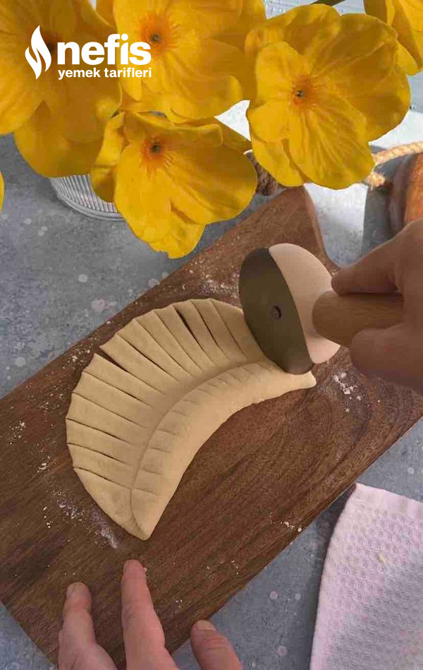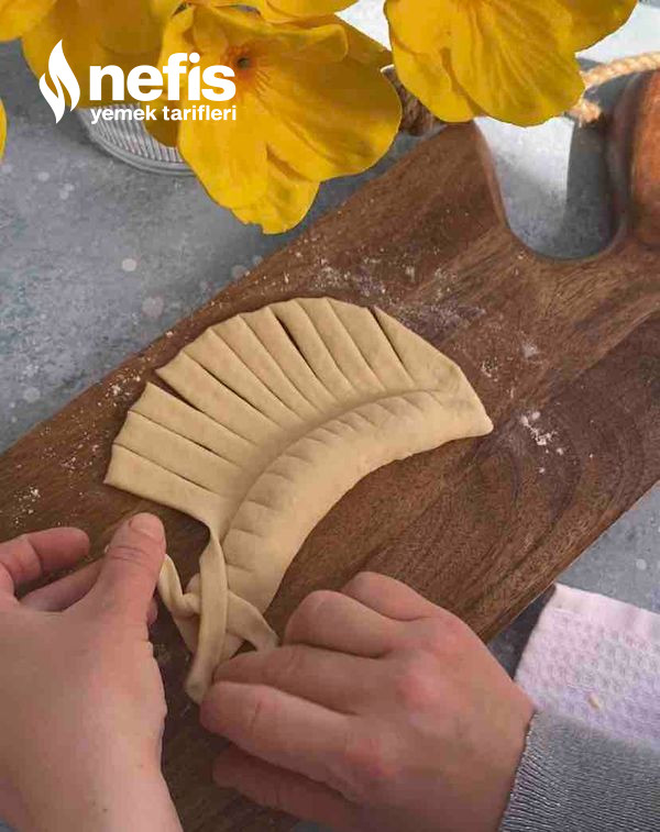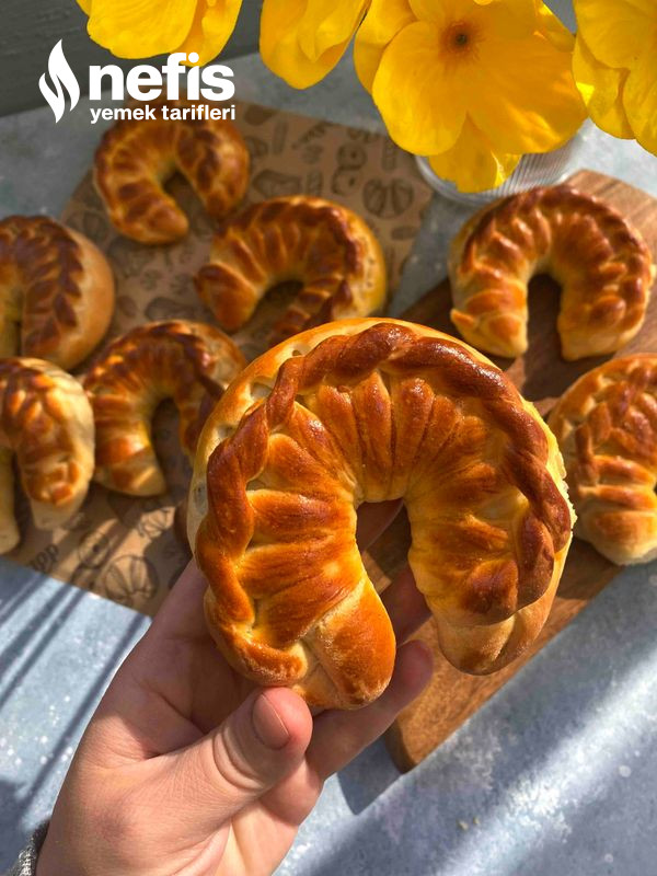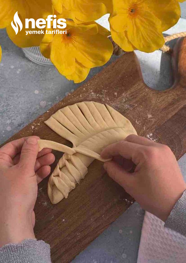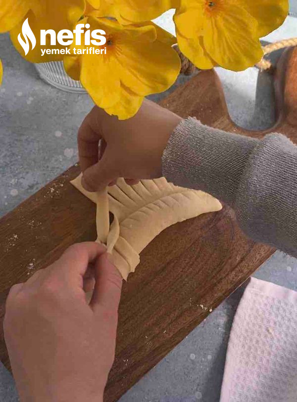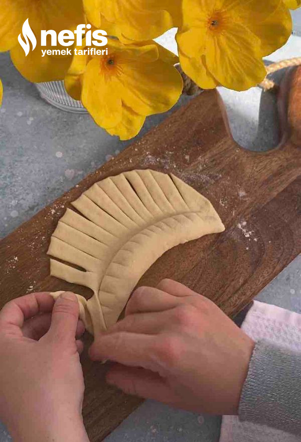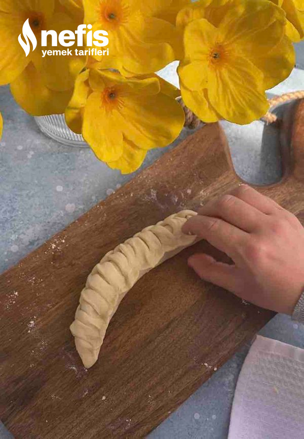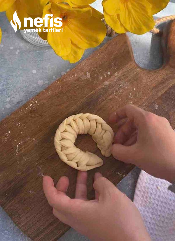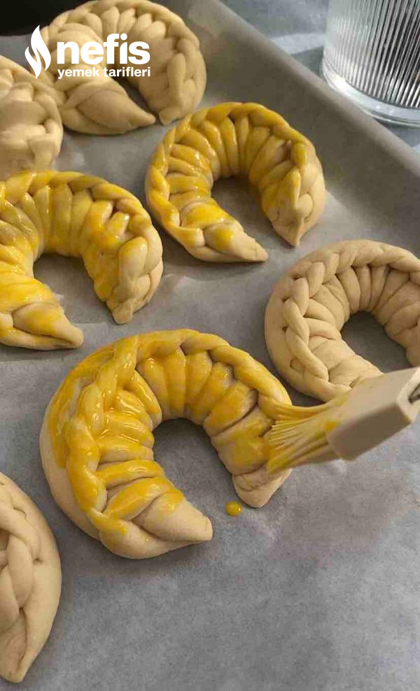 - Fotoğraflarda gördüğümüz üzere örgüler yapalım. (elimize aldığımız 2 kesimden sağ taraftakini alttan oburunu üstten geçirerek sonuna kadar ilerleyelim) en son uçlarını birleştirip ay biçimi verelim ve yağlı kağıt serili fırın tepsisine aralıklı dizelim.