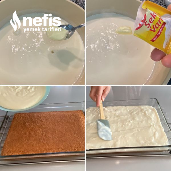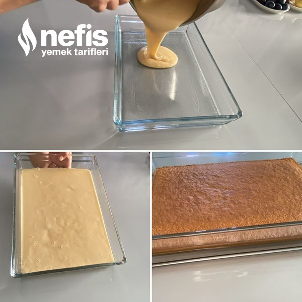 - Kekimizi fırından çıkartıp iyicene soğuduktan sonra muhallebimizi üzerine dökelim buzdolabına koyup 2 saat dinlendirelim.