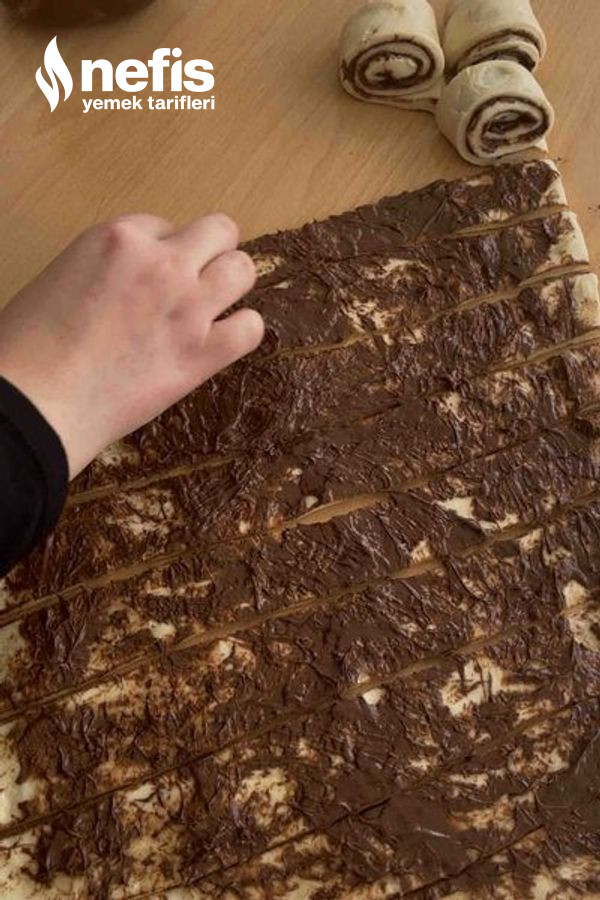 6. Dikdörtgen halinde açıp üzerine çikolata sürüp şerit halinde keselim ve saralım.