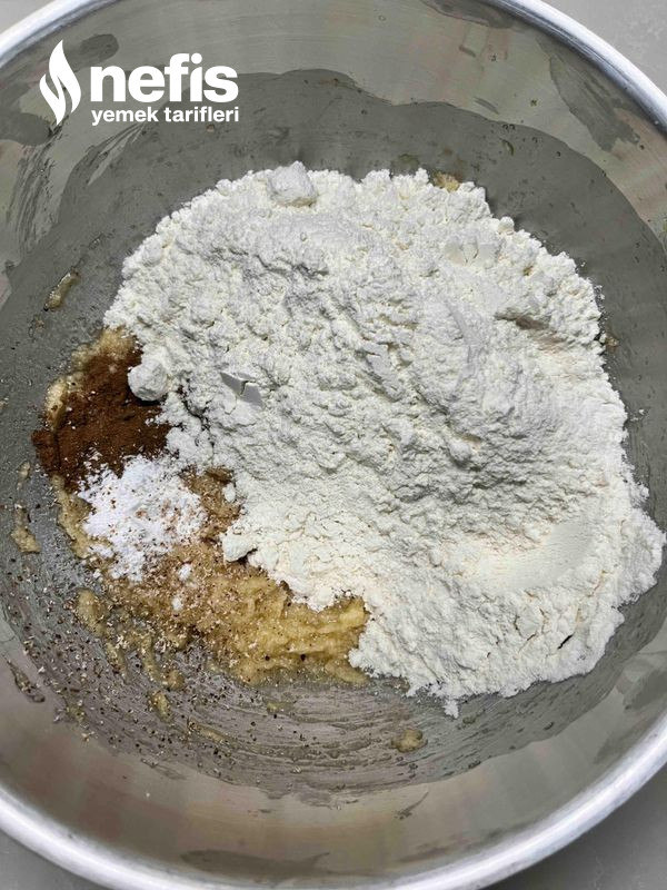 3. Un, kabartma tozu, tarçın, tuz ve muskat cevizi rendesini de ekleyerek spatula yardımı ile güzelce karıştırın.