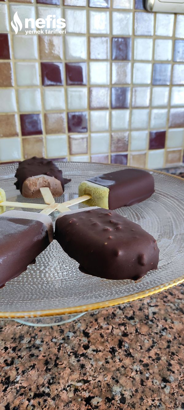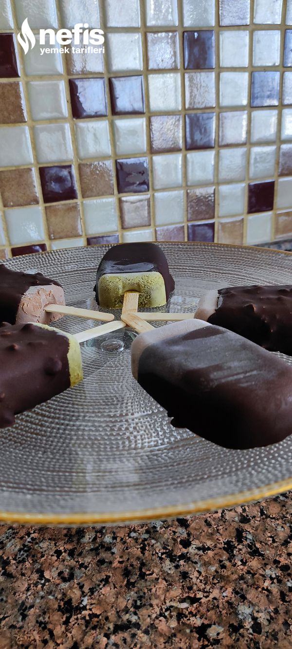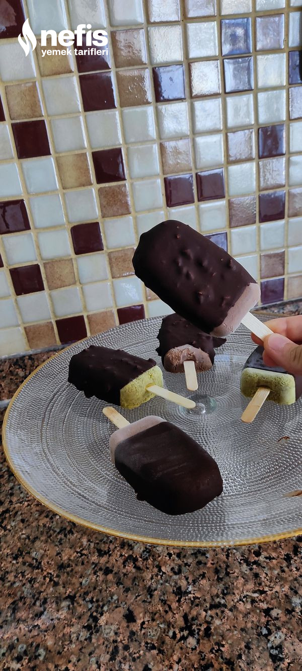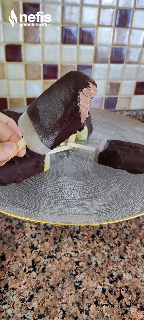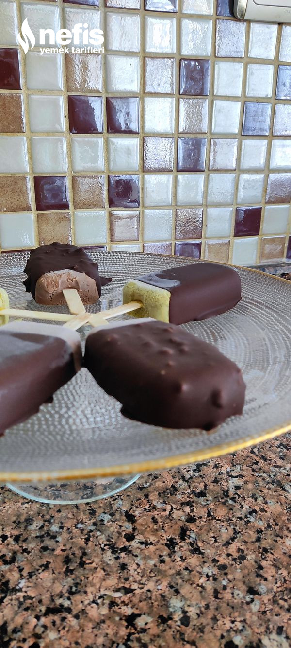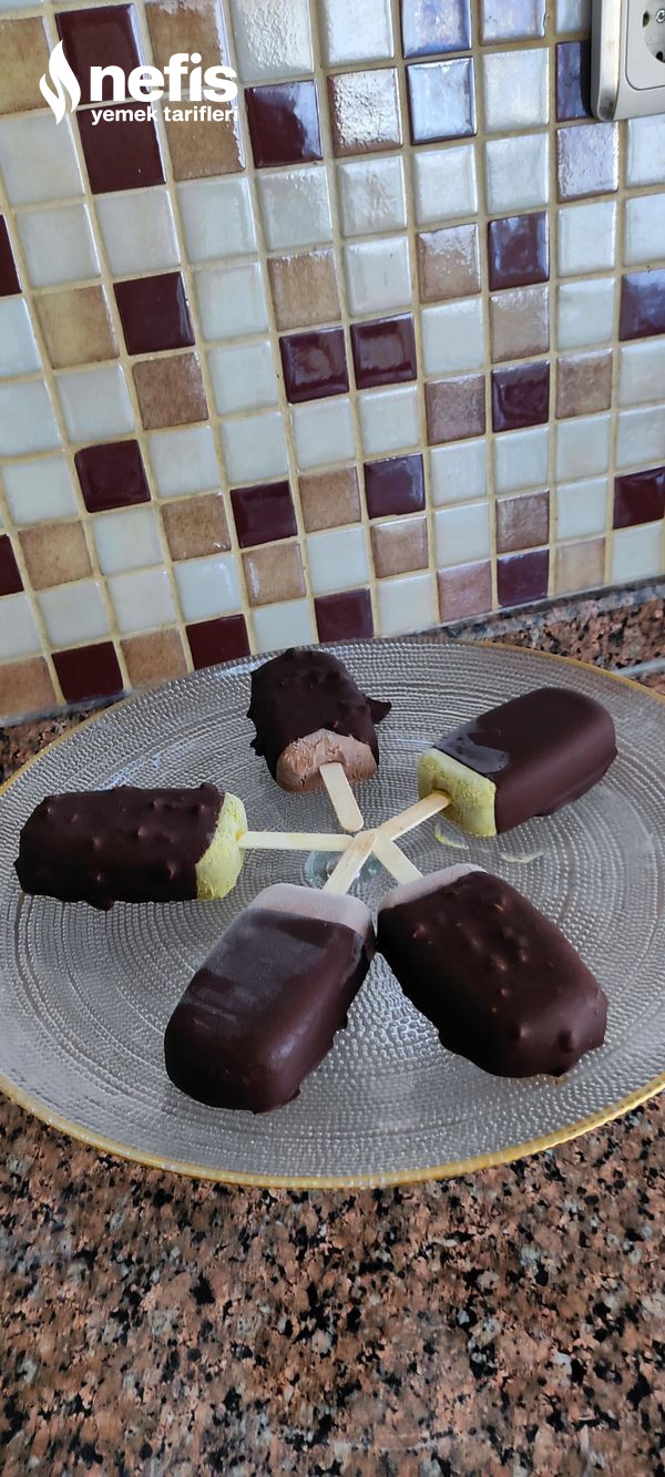 - Dondurma kalıplarına eşit ölçüde dökün. Ben sıkma torbası ile döktüm daha kolay oluyor. 1 gece buzdolabında bekletin. Sonra eritilmiş çikolataya bandırın. 2-3 saat buzdolabında bekletip, tüketin.