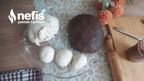 3. Az olan kısıma kakao ,su ve sıvı yağını ekleyerek 1-2 dakika tekrar yoğuralım ,2 hamuru da üzerini örterek mayalanmaya bırakalım.