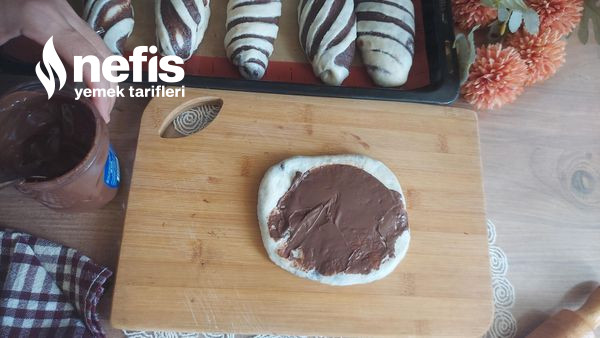 6. Bıçakla çizikler atarak zıt çevirip üzerine çikolata sürerek sarıp rulo yapalım, fırın tepsisine alarak üzerine ayırdığımız yumurta sarısı ve sıvı yağını karıştırarak fırça ile sürelim.