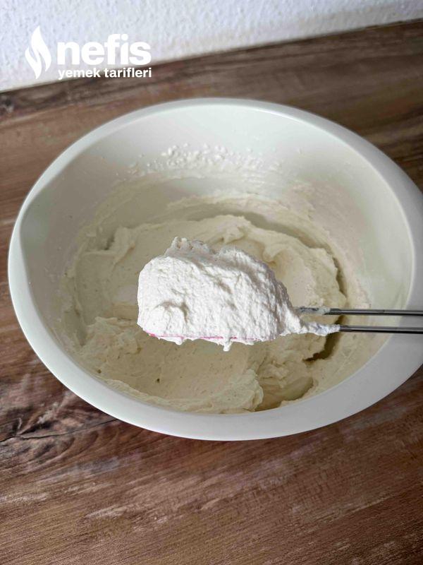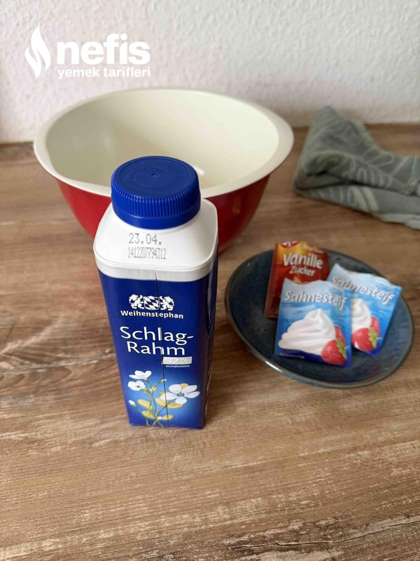 11. Kreması için 2,5 kutu soğuk sıvı kremanızı karıştırma kabınıza alın. Krema sertleştirici ve vanilya şekerini de ekleyip mikserle kıvam alana kadar orta süratte çırpın.