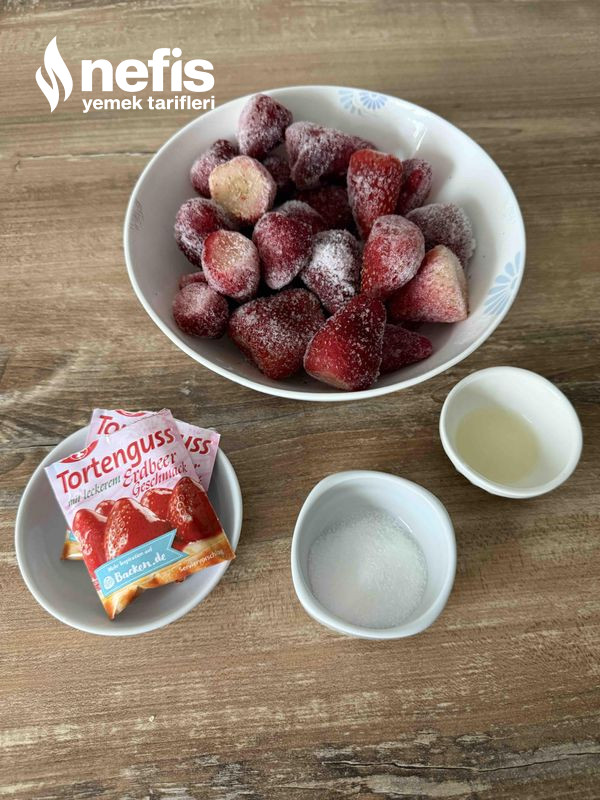 7. Çilekli dolgusu için dondurulmuş çilekleri, limon suyunu ve şekeri bir tencereye alıp orta ateşte çileklerin buzu çözülene kadar pişirin.