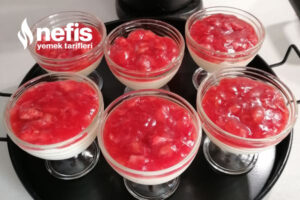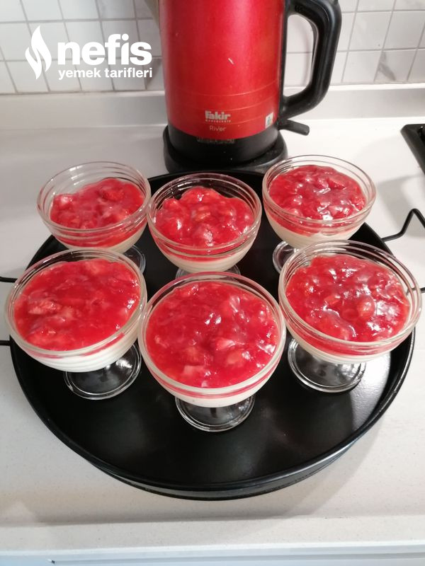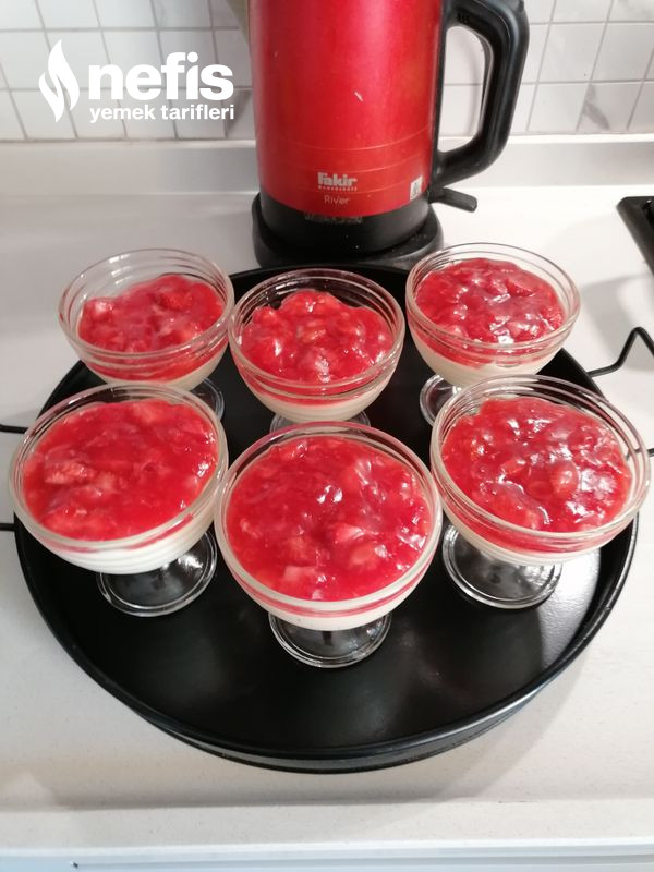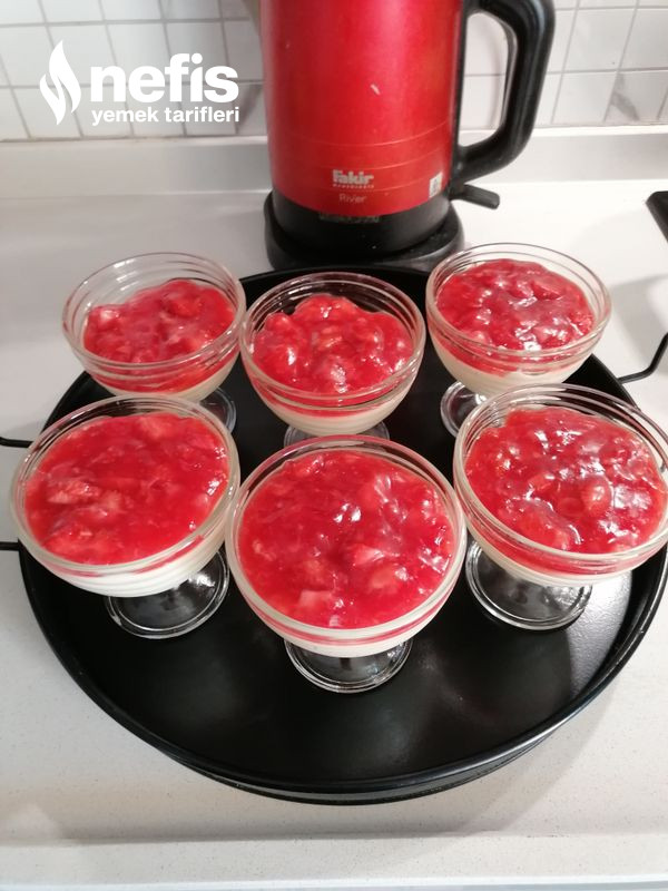- Çileği yıkayıp dilimlere ayıralım. Tencereye koyup, üzerine nişasta, şeker ve suyunu koyup karıştırarak pişirelim. Yoğunlaşınca kaselerin üzerine dökelim.