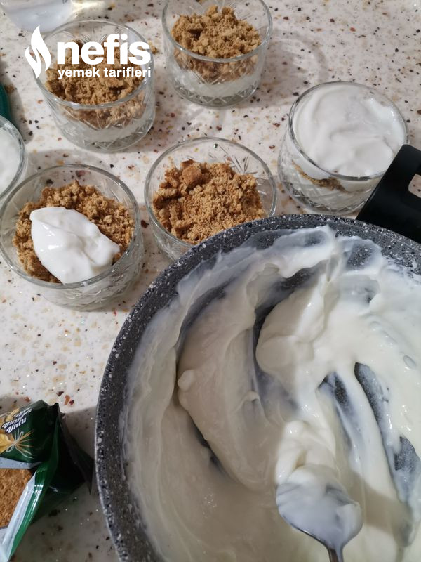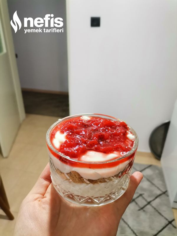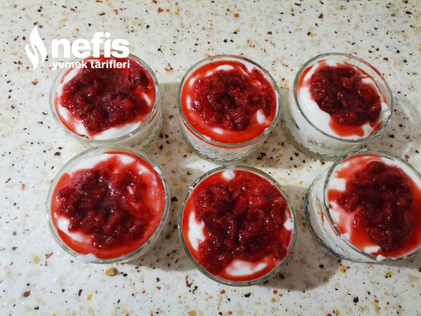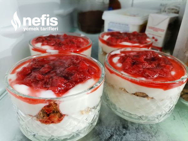 4. Kasenin en altına muhallebi orta katına yulaflı bisküvi üzerine tekrar muhallebi ve en üste çilek sos gelecek halde kaselenir.