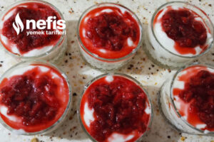 4. Kasenin en altına muhallebi orta katına yulaflı bisküvi üzerine tekrar muhallebi ve en üste çilek sos gelecek halde kaselenir.