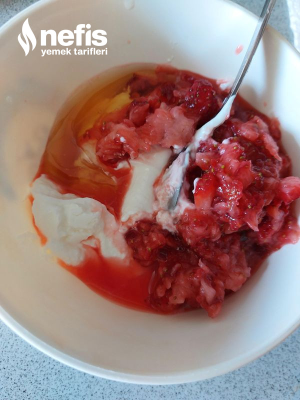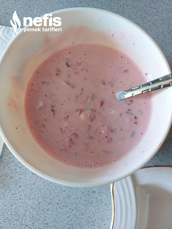 - Ezdiğimiz çileklerin üzerine yoğurt ve bal ek edip güzelce çırpıyoruz.