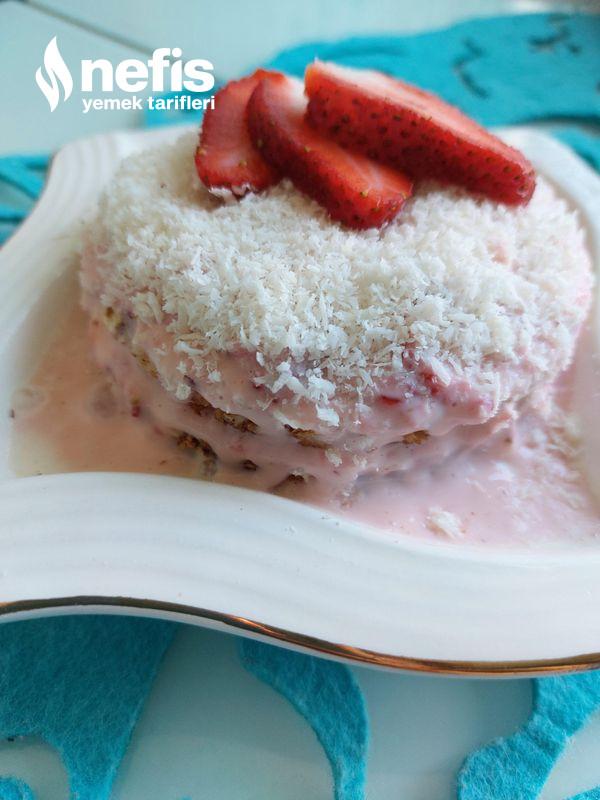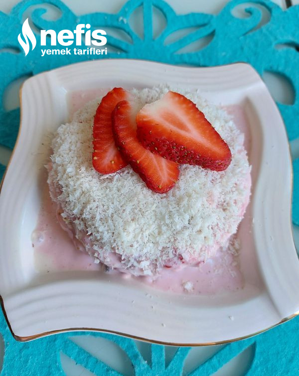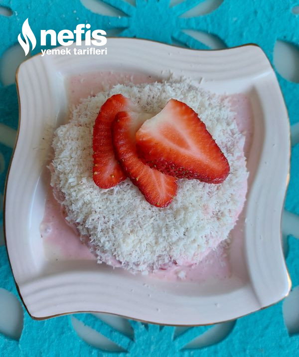- Üzerine hindistan cevizi serpiyoruz. Çileği de dilimleyerek yerleştiriyoruz ve buzdolabında soğumaya bırakıyoruz.Afiyet olsun 🌸.
