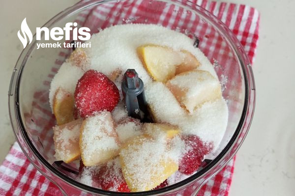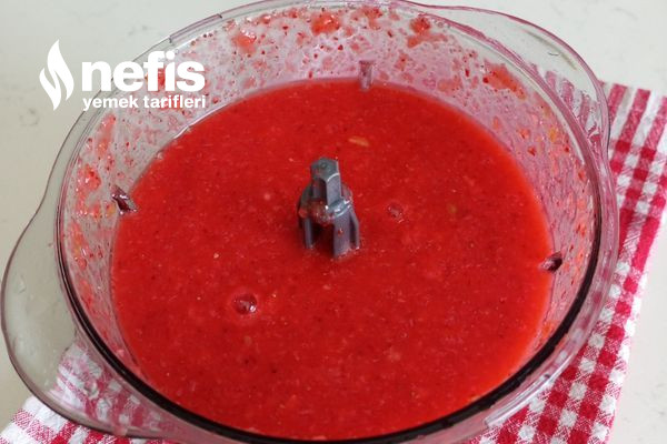 - Daha sonra blendera limon yıkadığımız çilek ve şekeri ilave edip püre haline gelinceye kadar çekelim.
