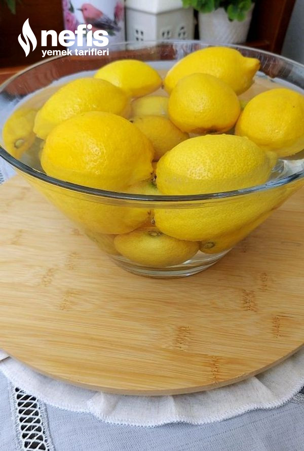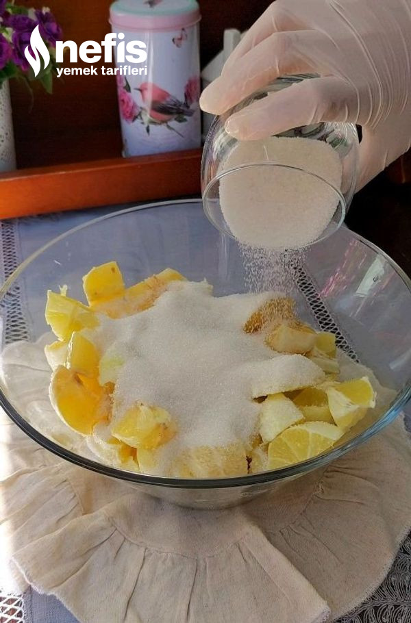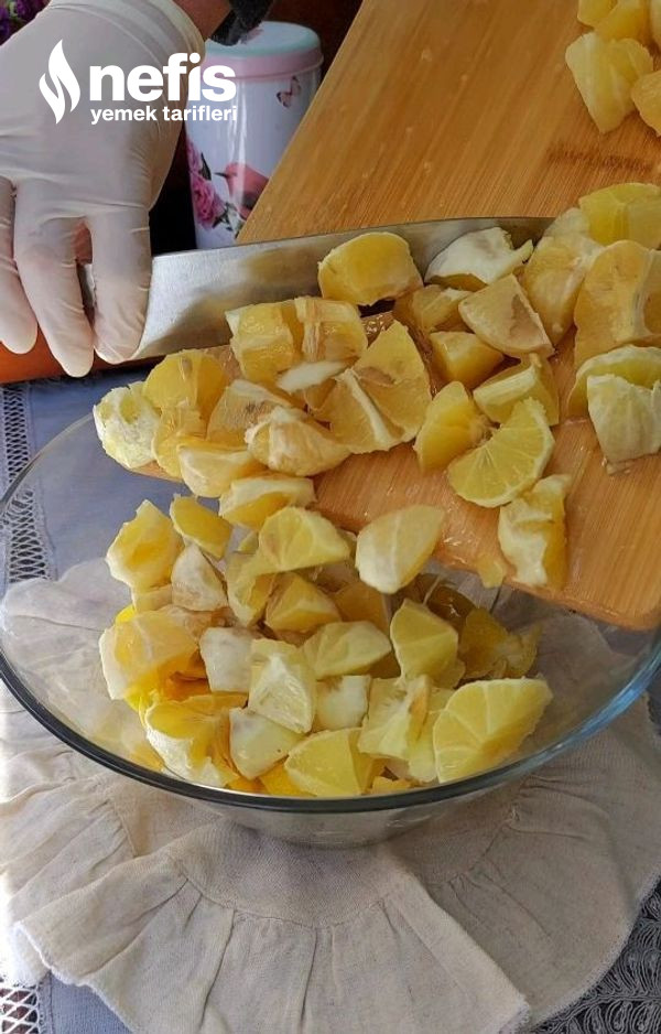 - Limonları soyduktan sonra uygun bir kaba küp küp doğrayıp, üzerine 1,5 su.