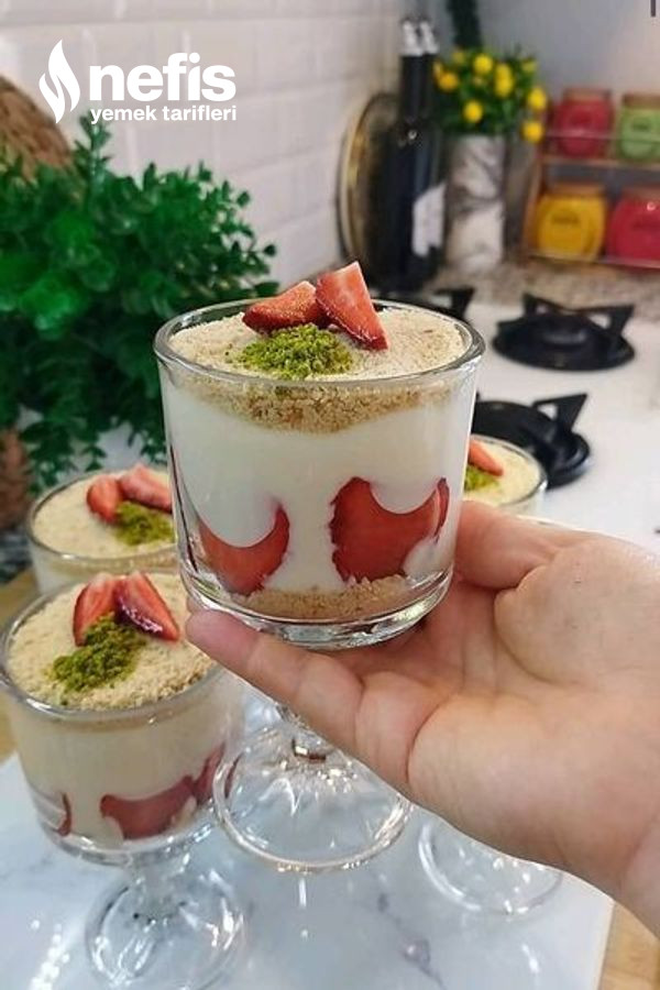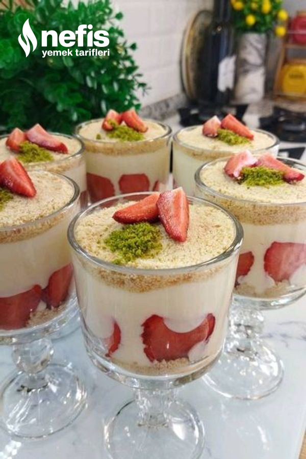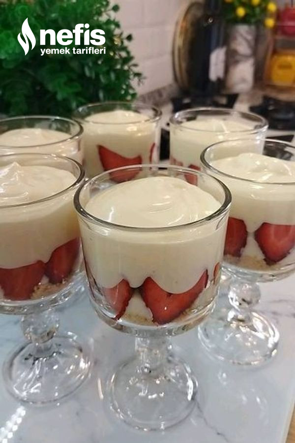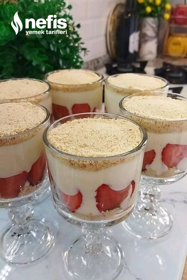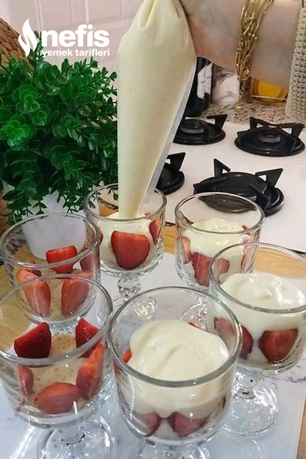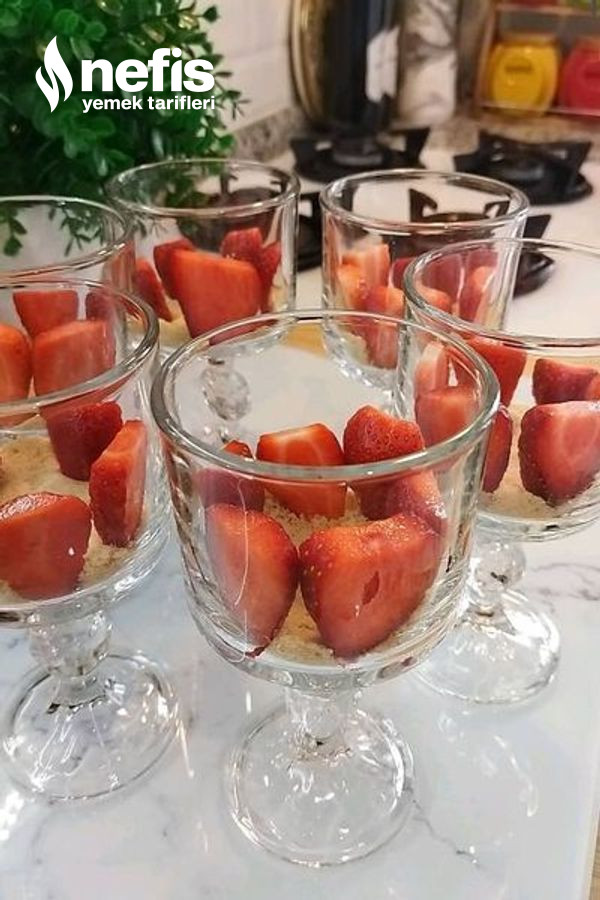 - Cuplara evvel bisküvi sonra kesilmiş çilekleri yerleştirin.
