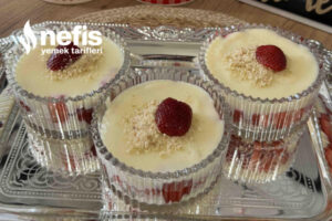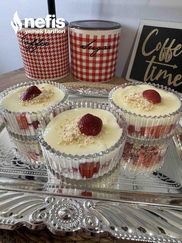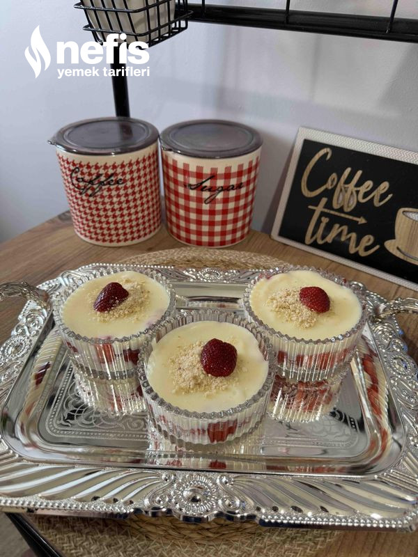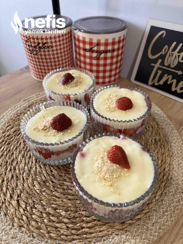 - Tüm bisküvi, puding ve çilekler bitene kadar kuplara bu halde bölüştürün. Akabinde buzdolabında 3-4 saat kadar soğumaya bırakın.