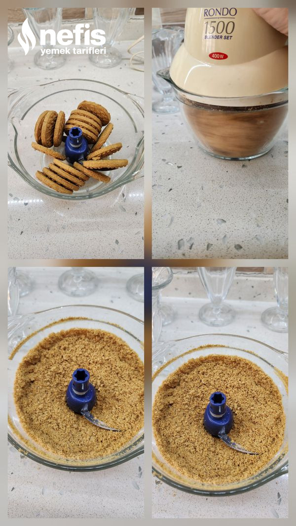 - Uygun kaselere ikişer tatlı kaşığı bisküvi kırıntısı dökülür.
