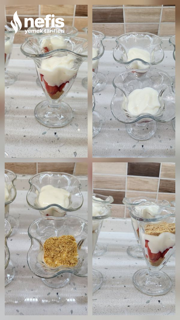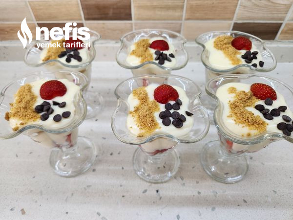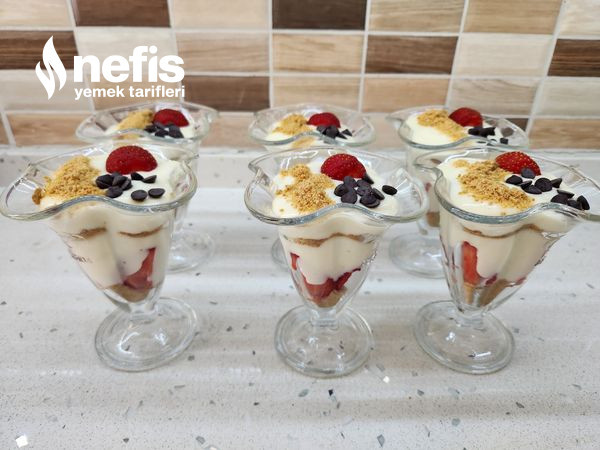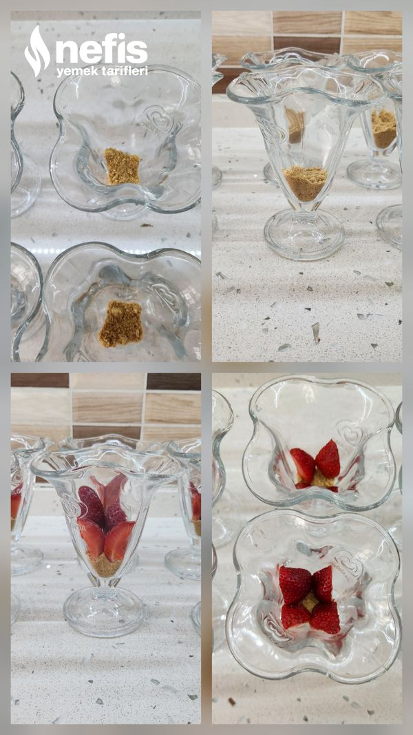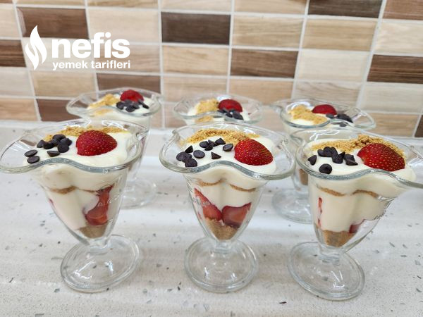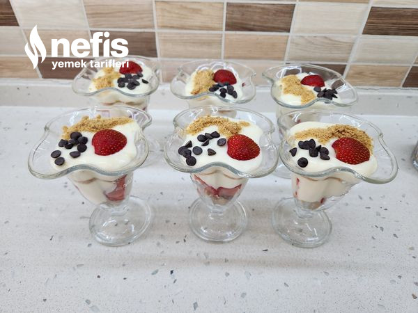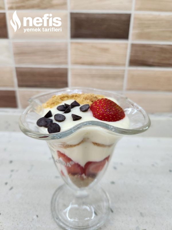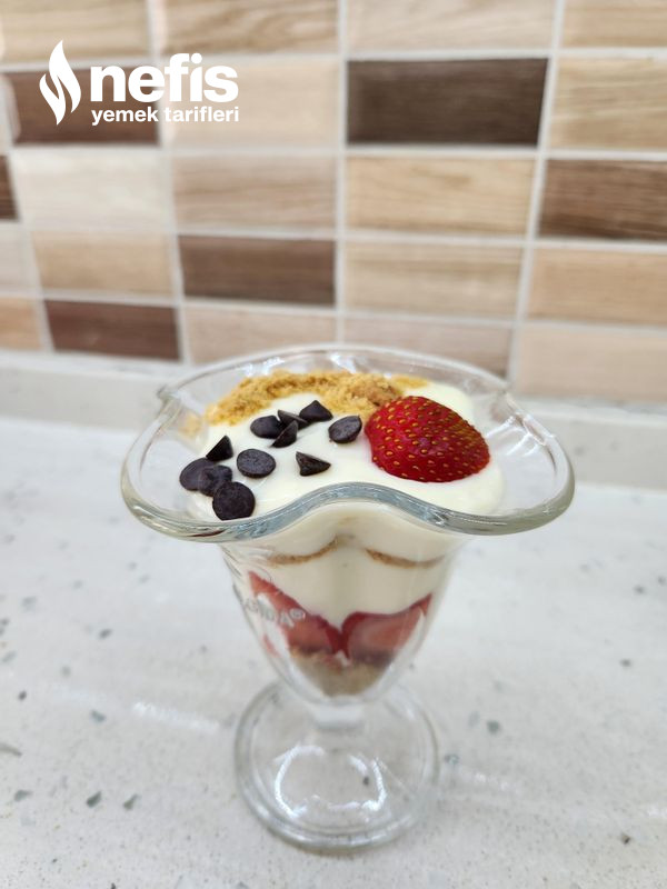 - Üzeri bisküvi kırıntısı, damla çikolata ve çilek ile süslenir.