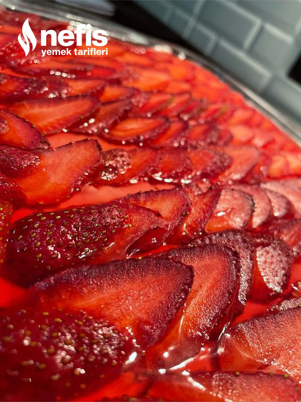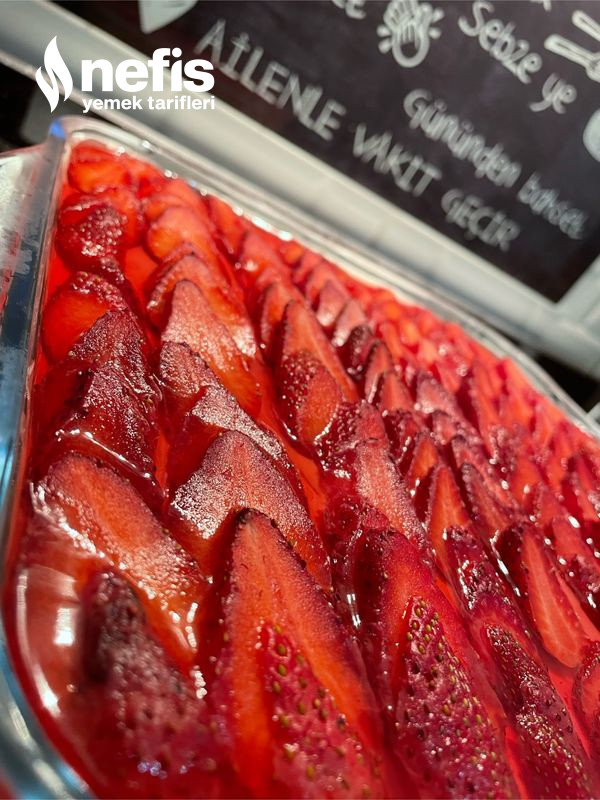 - Hazırladığımız çilek aromalı bitkisel jeli pastamızın üzerine dökelim.