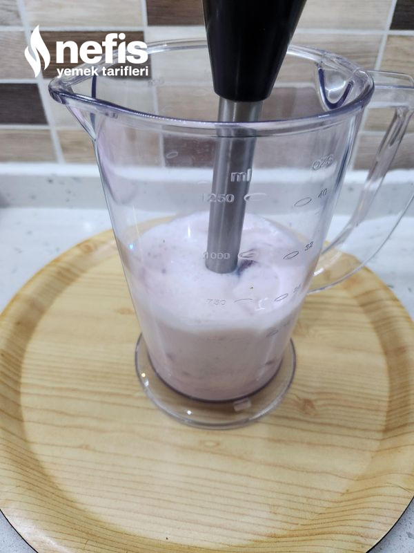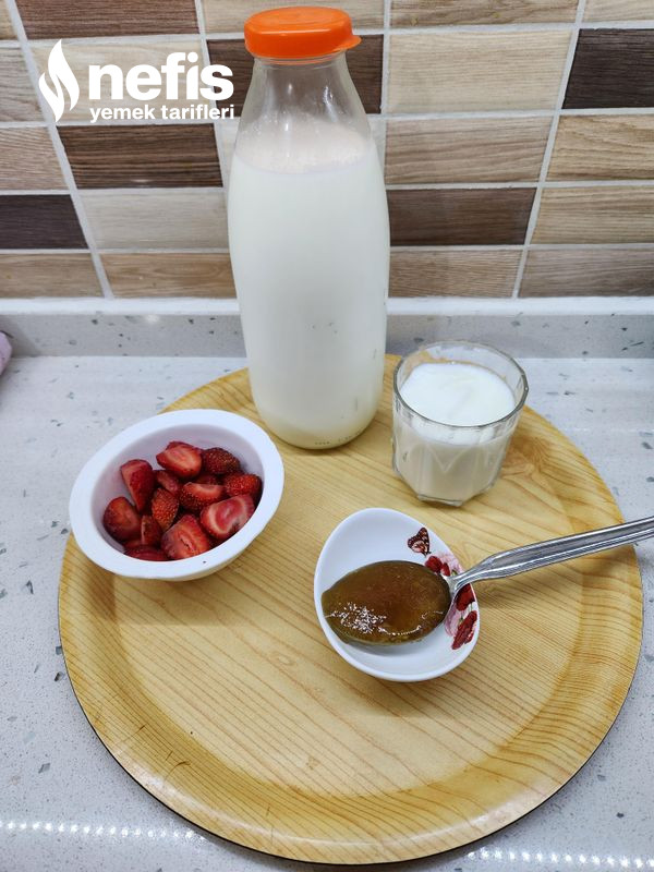 2. Uygun bir kaba yoğurt, bal, çilekler ve süt ek edilir. (süt ve yoğurt soğuk olmalı).