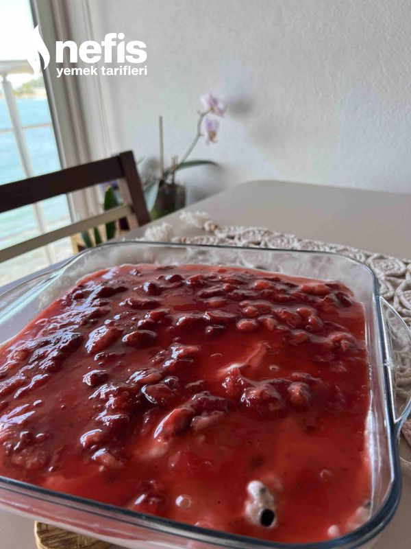 5. Çilekleri nişasta ve şekerle kıvam alana kadar ocakta karıştırıp hafif soğuyunca tatlımızın üzerine dökelim. Dolaba atıp soğutalım. Afiyet olsun.