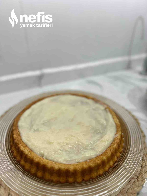 13. Ilık muhallebiyi kekin üzerine dökelim spatula ile düzleyelim.