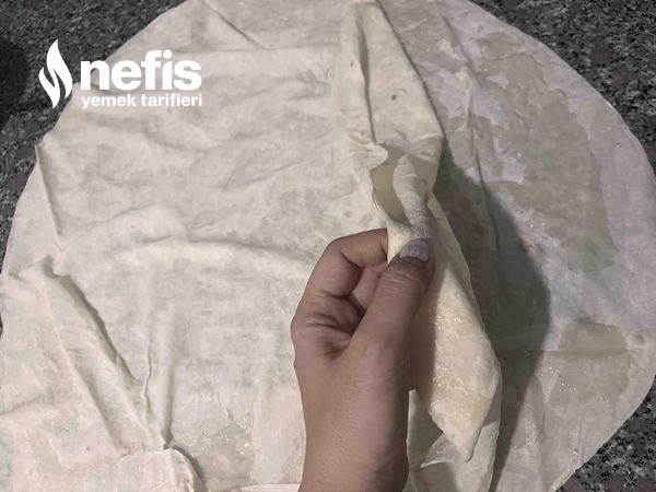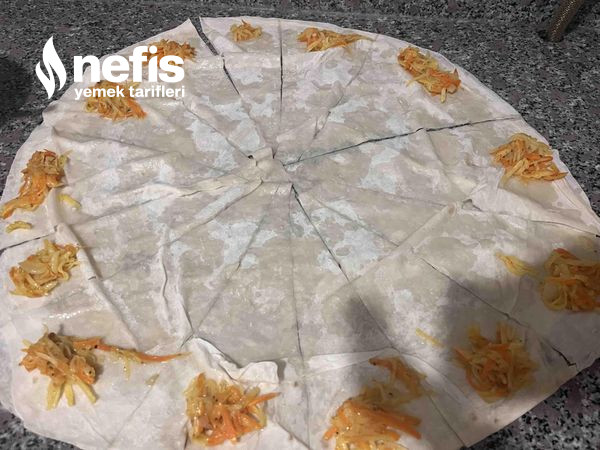 - Yufkamızı üçgen sarılacak biçimde keselim. İç harcını koyup saralım.