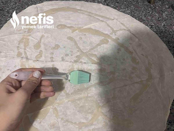 - Tezgaha bir yufkayı serip üzerine fırça yardımıyla sirke-un-sıvı yağ karışımını yayalım.