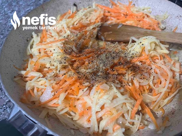 - Pembeleşince rendelenen patatesi ve havucu ekleyelim.