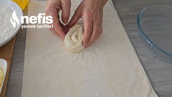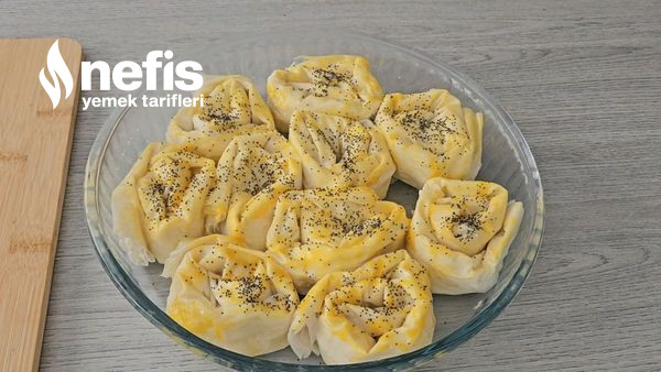 4. Gül böreği formunda sarın, üzerine yumurta sarısını sürün.