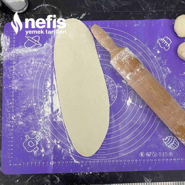 - Bir bezeyi merdane yardımıyla uzunlamasına açıyoruz yağlı kağıt serdiğimiz tepsiye açtığımız hamuru koyup, kıyma harcından kenarda boşluk bırakacak biçimde koyuyoruz üzerine biraz kaşar koyup kenarlarını üste atıyoruz.