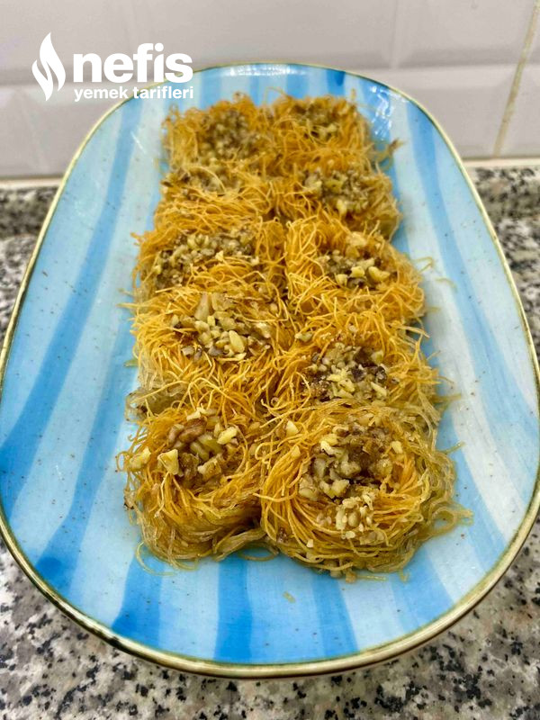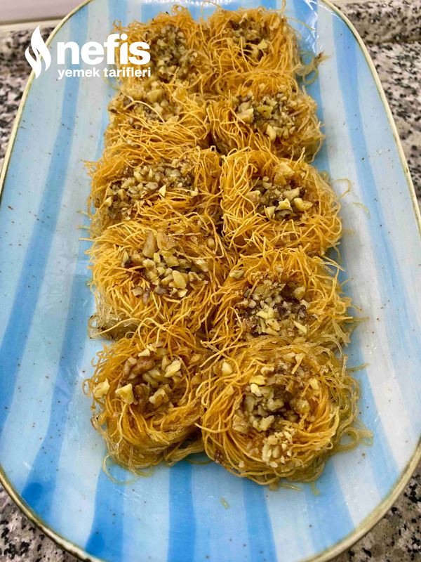 - Kadayıftan modüller koparıp parmağımıza dolayarak saralım ve kuş yuvası görünümü verelim tepsiye dizelim kadayıf bitene kadar hepsine birebir halde saralım kalan yağı da kadayıfların üzerine dökelim.