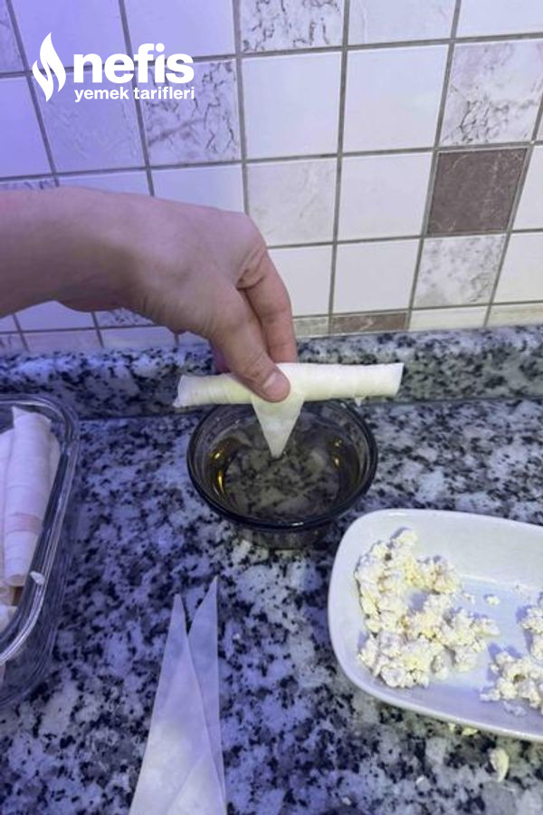 2. Son olarak yufkanın uç kısmını hazırladığımız kase suyun içine batırıp bırakıyoruz.