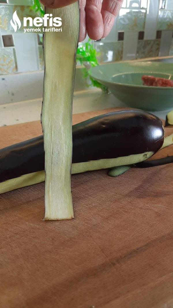 1. Öncelikle patlıcanlarımızı fotoğraftaki üzere başından ve ucundan birazcık keselim ,uzunlamasına iki tarafına çizgi yapalım ve bir soyacakla ince ince keselim .