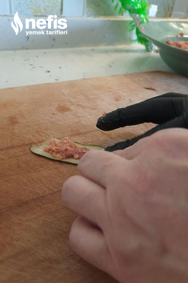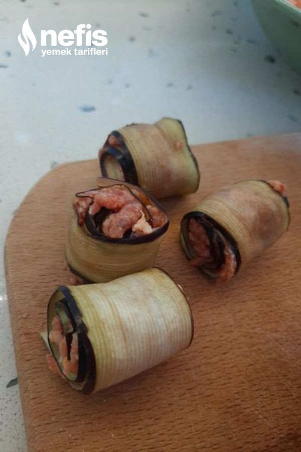 4. Patlıcanlarumızın içine ince katman halinde kıymayı döşeyip rulo üzere saralım, bütün hepsini yapalım ve sosunuda bütün malzemeleti ekleyip topaklanmasın diye düzgünce çırpalım.