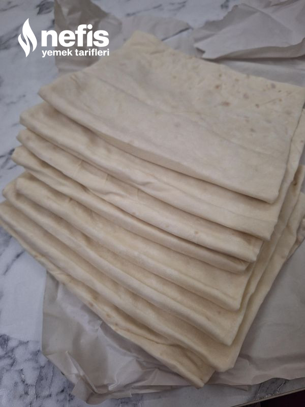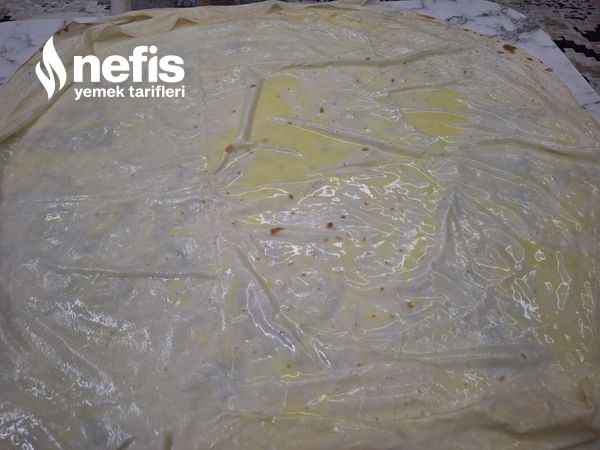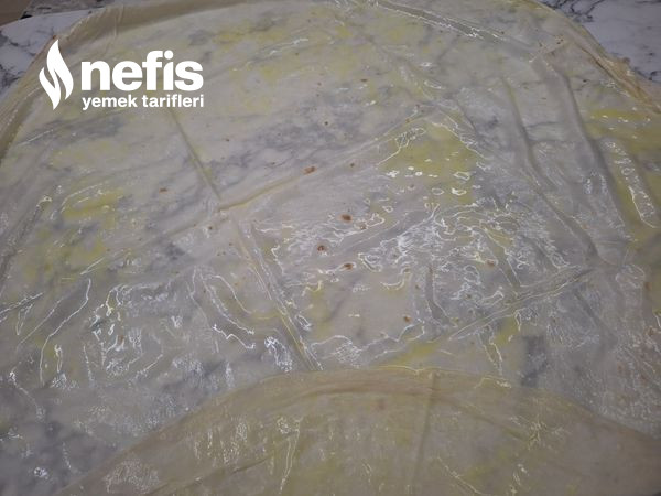 - 2 yufkayı tıpkı formda seriyoruz 3 yufkaya kadar tıpkı süreci yapıyoruz ,en üstüne tekrar sosu sürüp pizza biçiminde mümkün olduğunca en küçük dilim formunda kesin.